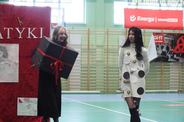 Kolejnym elementem Dnia Matematyki był pokaz mody - i tu młodzież wykazała swoją pomysłowość. Było pudło z niespodzianką, ubiory "liczbowe", kreacje wieczorowe i dzienne, robocze i dystyngowane- a wszystkie okraszone liczbami, cyframi.... Konkurs "Jeden z dzisięciu" był najtrudniejszy, bowiem trzeba było wykazać się bystrością umysłu, liczeniem w pamięci, znajomością prawideł matematycznych, logicznym i abstrakcyjnym myśleniem. Ciekawą konkurencją była "niespodzianka" przygotowana przez poszczególne klasy. Jak sobie poradzili? Moim zdaniem - wyśmienicie! A co było w repertuarze? Klasa 1c przygotowała konkurs dla wszystkich pozostałych uczestników - trzeba było pokonać tor przeszkód (chodzienie z książką na głowie, z piłeczką ping pongową na łyżce, czy skakać na jednej nodze) by przystąpić do rozwiązywania zadań matematycznych! Klasa 2a stworzyła kompozycje liczbowe utworzone przez uczniów w formie równań z jedną niewiadomą. Nagrodą za poprawne odpowiedzi były fanty. Klasa 2b podeszła do sprawy lirycznie, poetycko - napisali wiersz i namalowali portert nauczyciela matematyki. Kolejna klasa - 1b to kreatywne pudło- niespodzianka - raz, dwa, trzy - wyskakujesz TY! 2c LO wprowadziła tajemniczy i wróżebny nastrój. Czarownice wróżbitki wieszczyły:" Przyjdzie po ciebie pani z matematyki....ale nie będzie sama.... z zagrożeniem!", "Jesteś spod znaku Pitagorasa, a wykresem twojego życia jest hiperbola.", " Jesteś niewymierny jak liczba Pi...", "Masz dziweczynę? A chcesz mieć? A znalazłeś swoją liczbę przeciwną? Nie? To będę ja!"