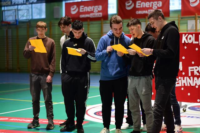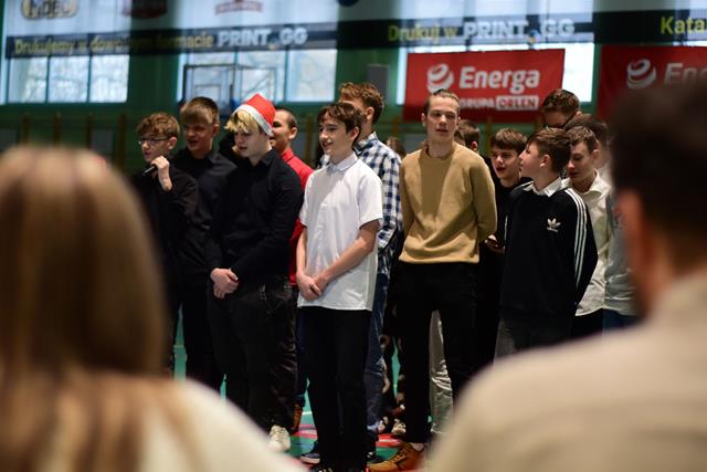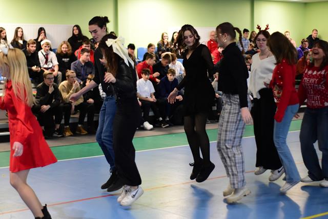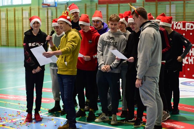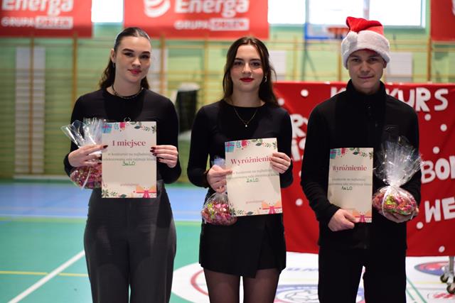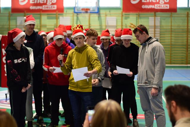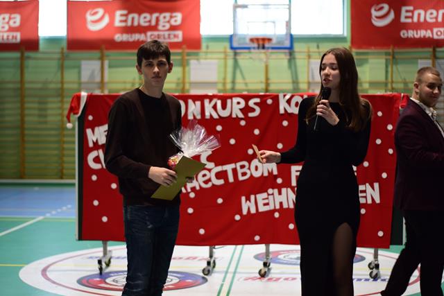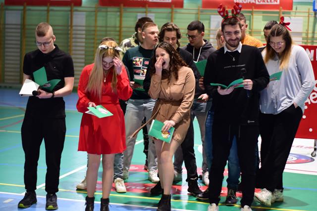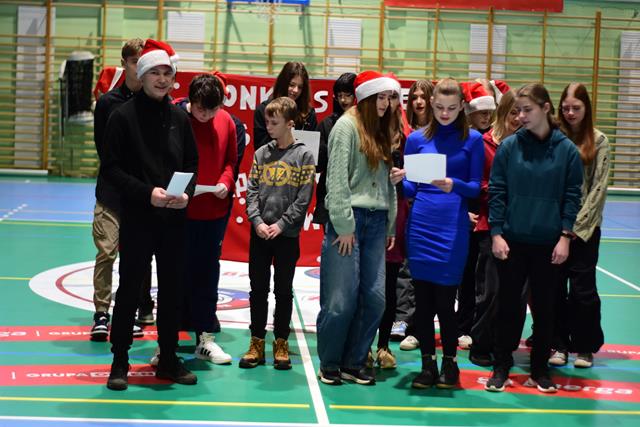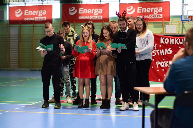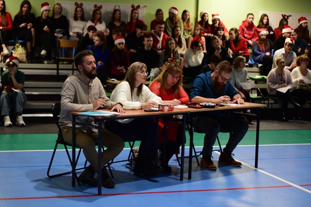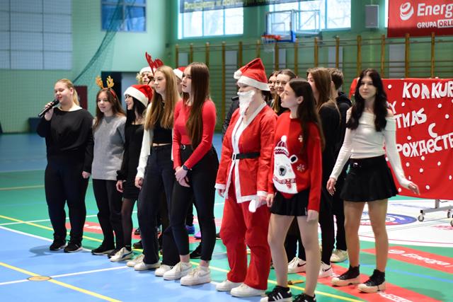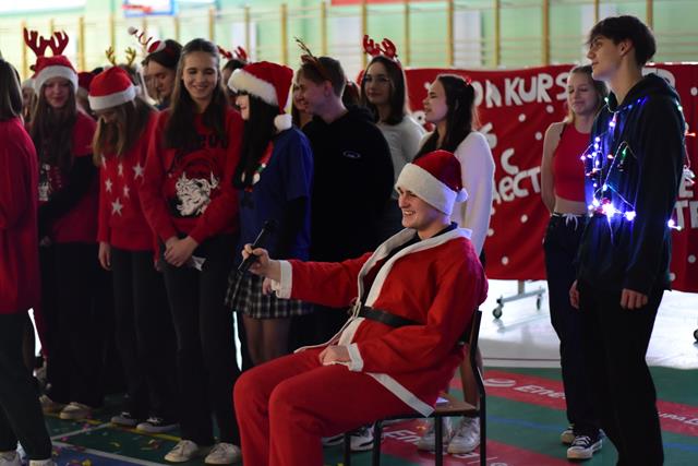 Od wielu lat w ostatni dzień nauki przed świętami Bożego Narodzenia w Zespole Szkół odbywa się konkurs piosenki świątecznej w języku obcym. To już szkolna tradycja, kiedy w szkole słychać wesołe dźwięki w języku angielskim. rosyjskim i niemieckim. Uczestnicy konkursu prześcigają się w pomysłach na strój świąteczny, gadżety świąteczne oraz inne efekty specjalne. Ma się wrażenie, że na szkolnej hali odbywa się zjazd świętych Mikołajów, śnieżynek, elfów, reniferów. Każdy chce wypaść jak najlepiej i jury docenia te starania. Niestety nie mogą wygrać wszyscy - toteż komisja oceniająca ma nie lada problem. Po burzliwych obradach i skrzętnym przeliczeniu punktacji wygrała w tym roku klasa 2b LO, drugie miejsce zajęła klasa 4a LO, zaś trzecie miejsce na podium przypadło klasie 3b LO. Konkurs cieszy się co roku dużą popularnością i prawie wszystkie klasy biorą w nim udział. Chwile z piosenką świąteczną umilają nam czas i wprawiają w bożonarodzeniowy nastrój. Do usłyszenia za rok!