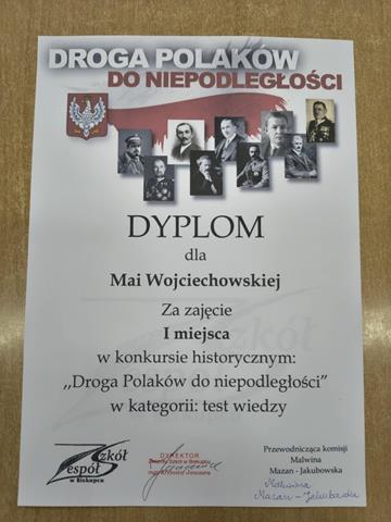 Jedną z form upamiętnienia Narodowego Święta Niepodległości, przypadającego co roku dnia 11-go listopada, był konkurs historyczny przeprowadzony w Zespole Szkół w Biskupcu, w którym wzięło udział 20 uczniów z klas licealnych. Piętnastu z nich przystąpiło do testu wiedzy, który miał miejsce dnia 6 listopada 2025 roku. Pozostali uczestnicy mieli możliwość wykazania się swoją pomysłowością w postaci pracy artystycznej (plakat, grafika, rysunek), ukazującej przebieg procesu uzyskania niepodległości przez nasz kraj w 1918 roku. Komisja konkursowa wyłoniła spośród uczestników - laureatów w dwóch kategoriach. Pierwsza dotyczyła formy artystycznej, w której wygrana przypadła – Weronice Walczykowskiej i Lenie Kuciej z klasy 1b LO. Natomiast najlepszy wynik z rozwiązanego testu wiedzy, uzyskała – Maja Wojciechowska z klasy 1a LO. Uczniowie ci otrzymali pamiątkowe dyplomy oraz symboliczne nagrody książkowe. Wszystkim uczestnikom dziękujemy za podjęcie wyzwania i wzięcie udziału w konkursie, a laureatom składamy serdeczne gratulacje.