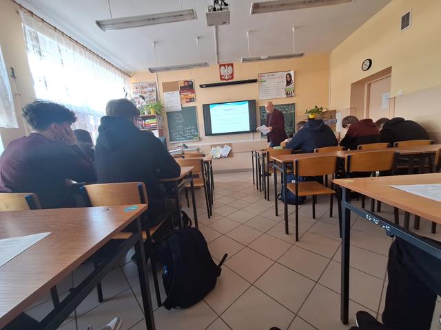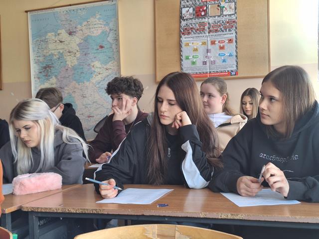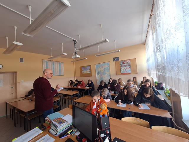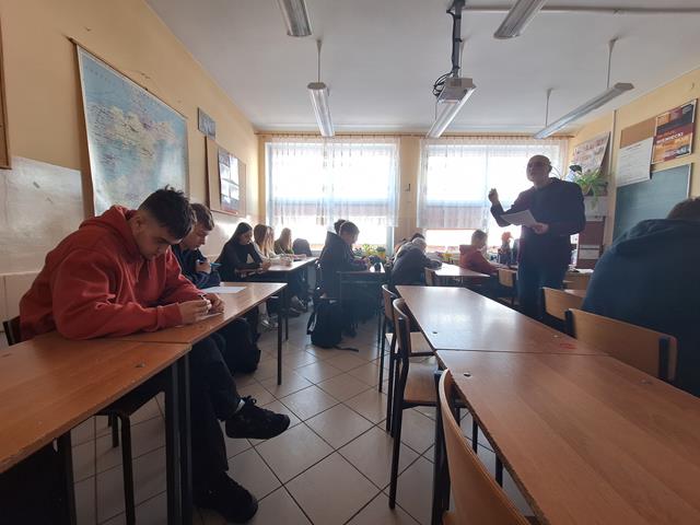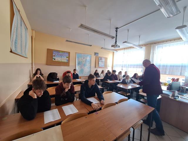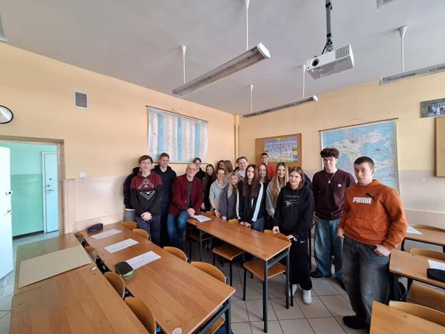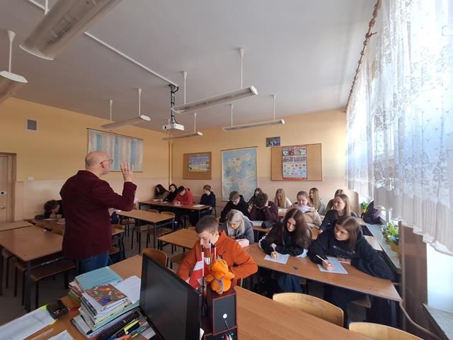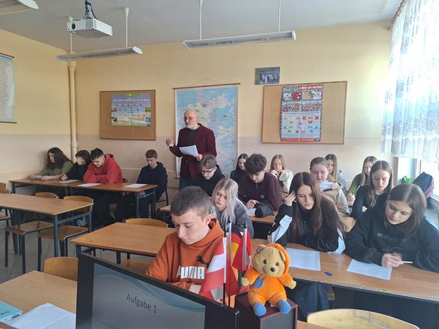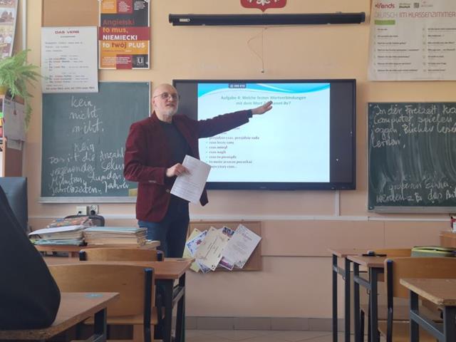 W dniu dzisiejszym gościliśmy dr habilitowanego Uniwersytetu Warmińsko-Mazurskiego Tomasza Żurawlewa, który z dużym entuzjazmem i pełnym profesjonalizmem poprowadził zajęcia z młodzieżą. Spotkanie poświęcone było pracy z literaturą obcojęzyczną, a dokładnie interpretacji wiersza Elli Michler „Ich wünsche dir Zeit” - „Życzę Tobie czasu”. Profesor w interesujący sposób wprowadzał uczniów w tematykę utworu, zachęcając ich do aktywnego udziału w zajęciach. Uczniowie uważnie słuchali, odpowiadali na pytania, głośno czytali wiersz oraz podejmowali próby jego ustnego tłumaczenia na język polski. Pracowali także z kartą zadań, analizując cechy języka niemieckiego, takie jak wymowa, ortografia, słowotwórstwo i składnia. W trakcie zajęć młodzież tworzyła i omawiała związki frazeologiczne z wyrazem „czas”, porównując je w języku polskim i niemieckim, m.in.: nie mieć na coś czasu, z biegiem czasu, tracić czas, czas leczy rany, czas minął, czas nagli, czas to pieniądz czy to może jeszcze poczekać. Uczniowie wspólnie analizowali ich znaczenie oraz zastosowanie w codziennych sytuacjach. Zajęcia miały dla uczniów charakter nowej formy pracy na lekcji języka obcego - połączenia nauki języka niemieckiego z literaturą oraz refleksją nad uniwersalnymi wartościami, takimi jak czas i jego znaczenie w życiu codziennym. Spotkanie spotkało się z dużym zainteresowaniem młodzieży i było dla nich cennym doświadczeniem edukacyjnym. Być może po dzisiejszych zajęciach wyłoni się wśród uczniów przyszły student germanistyki. Bardzo dziękujemy za dzisiejsze spotkanie i zapraszamy za rok.