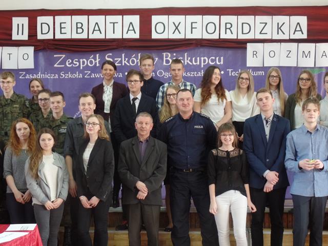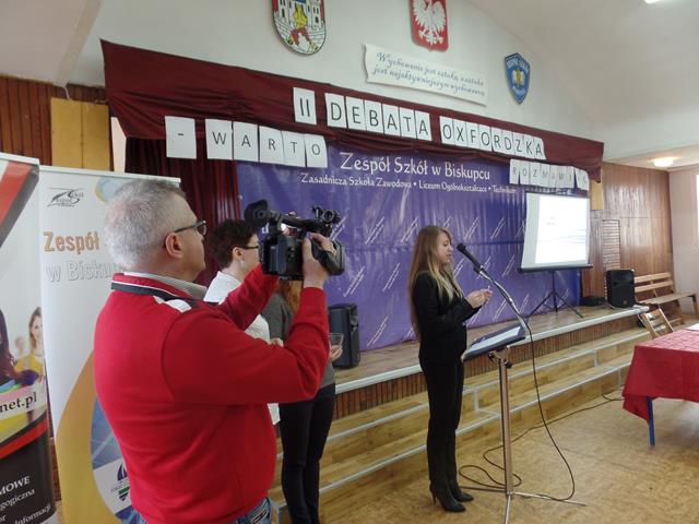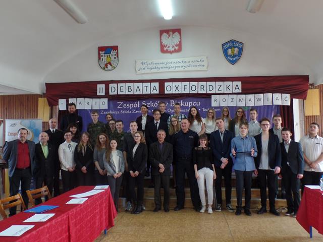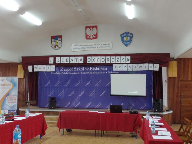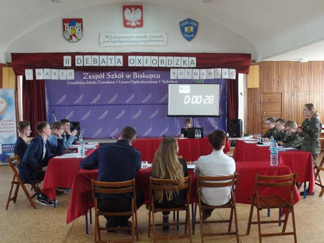 16 marca 2017 roku w Zespole Szkół w Biskupcu odbył się półfinał II Debaty Oxfordzkiej. Czym jest debata? Debata oxfordzka jest rodzajem dyskusji nad tezą, w której debatują jej obrońcy i przeciwnicy. W trakcie dyskusji zabronione jest obrażanie bądź wyśmiewanie argumentów strony przeciwnej. Nad całością debaty czuwa Marszałek mający do pomocy Sekretarza, który czuwa nad czasem i kolejnością zabierania głosu. W każdej drużynie występuje 4 mówców po każdej ze stron, którzy dysponują określonym czasem swojej wypowiedzi.
