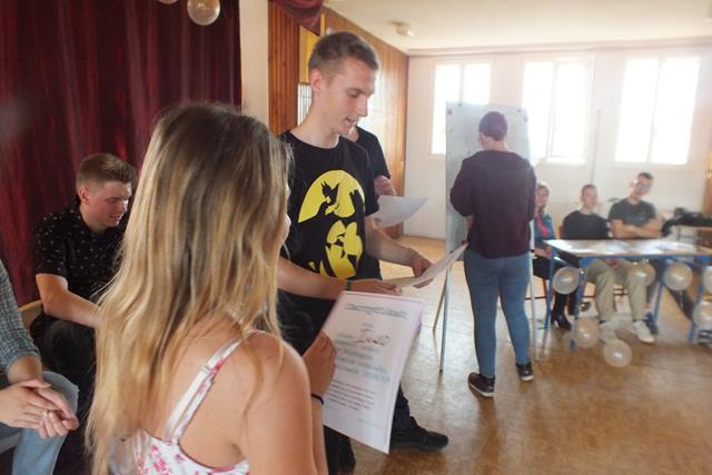 Jak co roku tradycyjnie młodzież starszych klas organizuje uroczyste przyjęcie młodych roczników w poczet braci uczniowskiej Zespołu Szkół - zwanych "otrzęsinami". Tym razem zaszczyt ten przypadł klasie 2b Liceum Ogólnokształcącego - uczniowie tej właśnie klasy wygrali rywalizację w ubiegłorocznych zawodach. Oprócz umiejętności fizyczno-sportowych takich jak - skakanie w worku, jedzenie jabłek bez użycia rąk, czy balansowanie ze świeżym jajkiem , była także sprawdzana podstawowa wiedza pierwszaków w zakresie znajomości topografii szkoły, stanowisk nauczycieli, czy wiedzy statystycznej. Zabawie towarzyszyła jak zawsze skoczna muzyka oraz dobre humory prowadzących i uczestniczących w niej uczniów. Jesteście już prawomocnymi uczniami Zespołu Szkół!