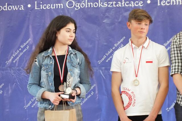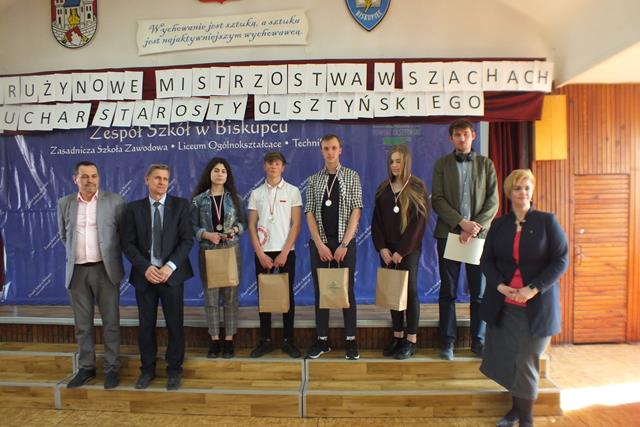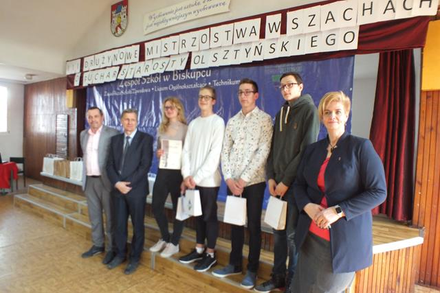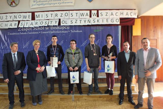 Puchar Przechodni zdobyła po zaciętej walce I drużyna I Liceum Ogólnokształcącego w Mrągowie przerywając dominację XII Liceum Ogólnokształcącego w Olsztynie, które ostatecznie zajęło II miejsce. III miejsce przypadło drużynie nr I gospodarzy Mistrzostw, czyli Zespołu Szkół w Biskupcu. Drużyna nr II uplasowała się na VII miejscu. Wywalczone miejsca to duży sukces naszych zawodników, którzy w większości nie posiadają dużego doświadczenia turniejowego (dla większości z nich był to pierwszy oficjalny turniej szachowy). W obu drużynach zagrało łącznie 4 zawodników z klas pierwszych – Lidia Bajcer, Maciej Kowalczyk, Jan Tomaszewski, Michał Woronowicz. Jeśli dodamy indywidualne wyróżnienia - Jakub Jundziłł (w debiutanckim turnieju II miejsce na II szachownicy), Aleksandra Ziejewska (III miejsce na IV szachownicy) - to widzimy, że możemy być zadowoleni i dumni z naszych uczniów.