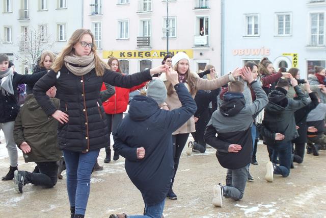 Młodzież z trzech klas maturalnych zaprezentowała jeden wspólny taniec. Tańczącym pośród spadających płatków śniegu przyglądali się licznie zgromadzeni przechodnie, koleżanki i koledzy z innych klas oraz rodzice uczniów. Polonez podobał się - widzowie zgodnie podkreślali zgranie tańczących, równe wykonywanie figur.