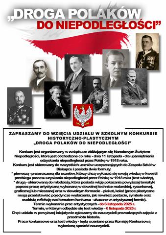 Zbliża się dzień 11 listopada - Dzień, w którym upamiętniamy odzyskanie niepodległości przez nasz kraj. Jak ważna jest niepodległość - nie trzeba nikogo przekonywać. Dlatego serdecznie zapraszamy do udziału w konkursie. Swoją wizję artystyczną możesz wyrazić w różny sposób - przeczytaj informacje zawarte na plakacie! Konkurs jest skierowany do wszystkich uczniów uczęszczających do Zespołu Szkół w Biskupcu!!!